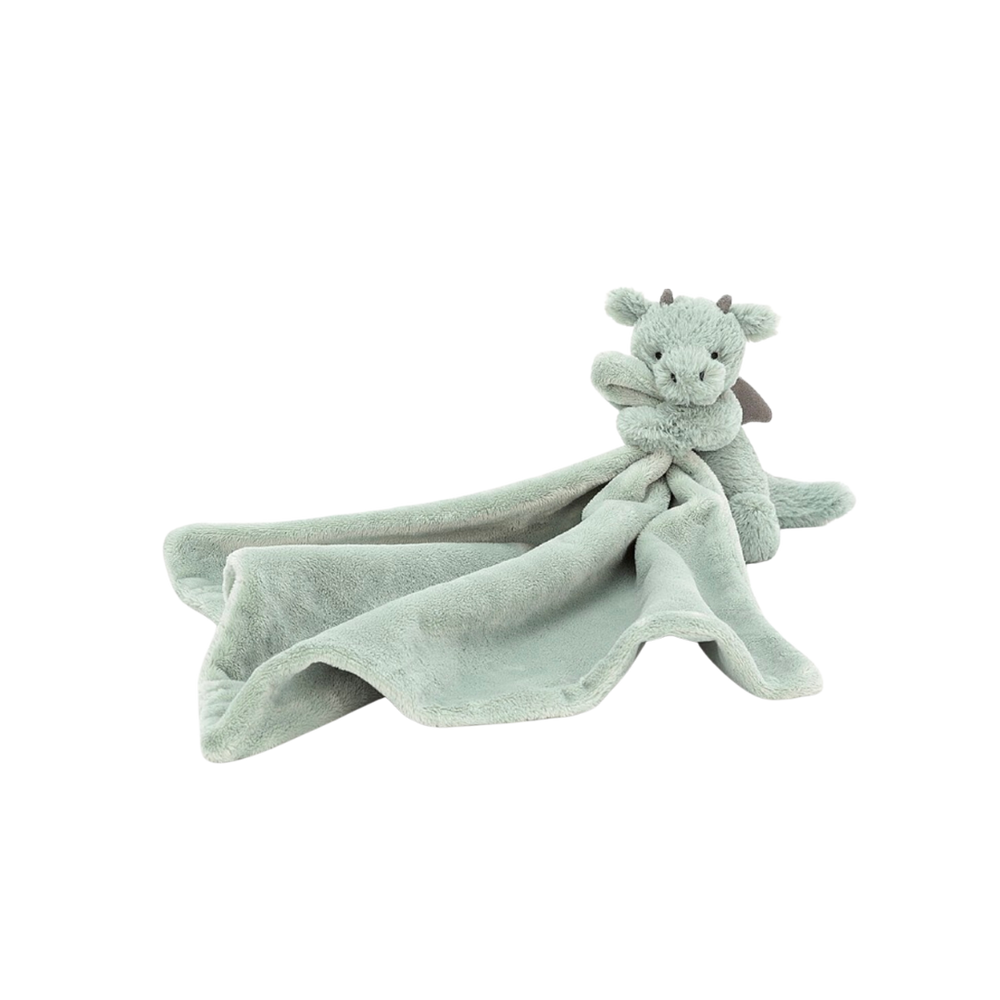 Bring a little enchantment to naptime with the Bashful Dragon Soother! This moss-green cutie clings to a dreamy-soft blankie, made from recycled fibers and perfect for snuggles, soothing, and sleepy spells. Rolled up with a Baby Jellycat ribbon, it’s a thoughtful gift for new arrivals or any little dragon-in-training.