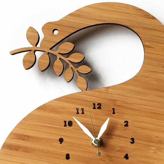 This Modern wall clock is shaped in green eating dinosaur, laser cut out of eco friendly bamboo. Size and feature below is below.
