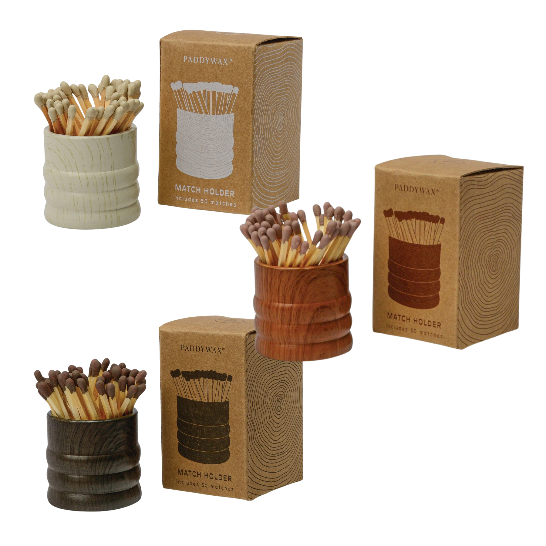 Strike up a little extra coziness! Inspired by the natural beauty of woodgrain, these ceramic match holders add rustic charm to your space. Each comes with 50 safety matches with colorful tips and is packaged in a kraft box—perfect for gifting or elevating your own fireplace ritual.