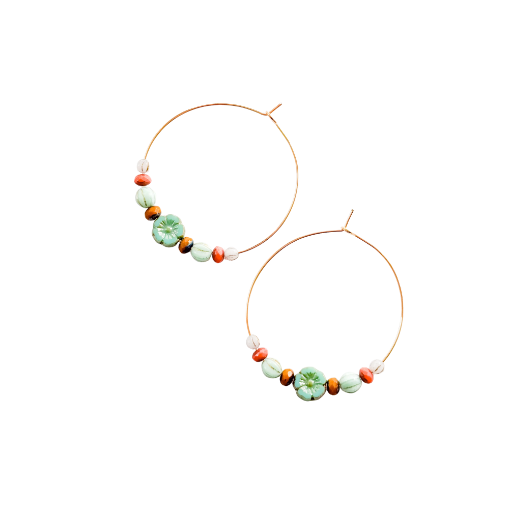 Big Gold Hoops with Turquoise Glass Flower Beads