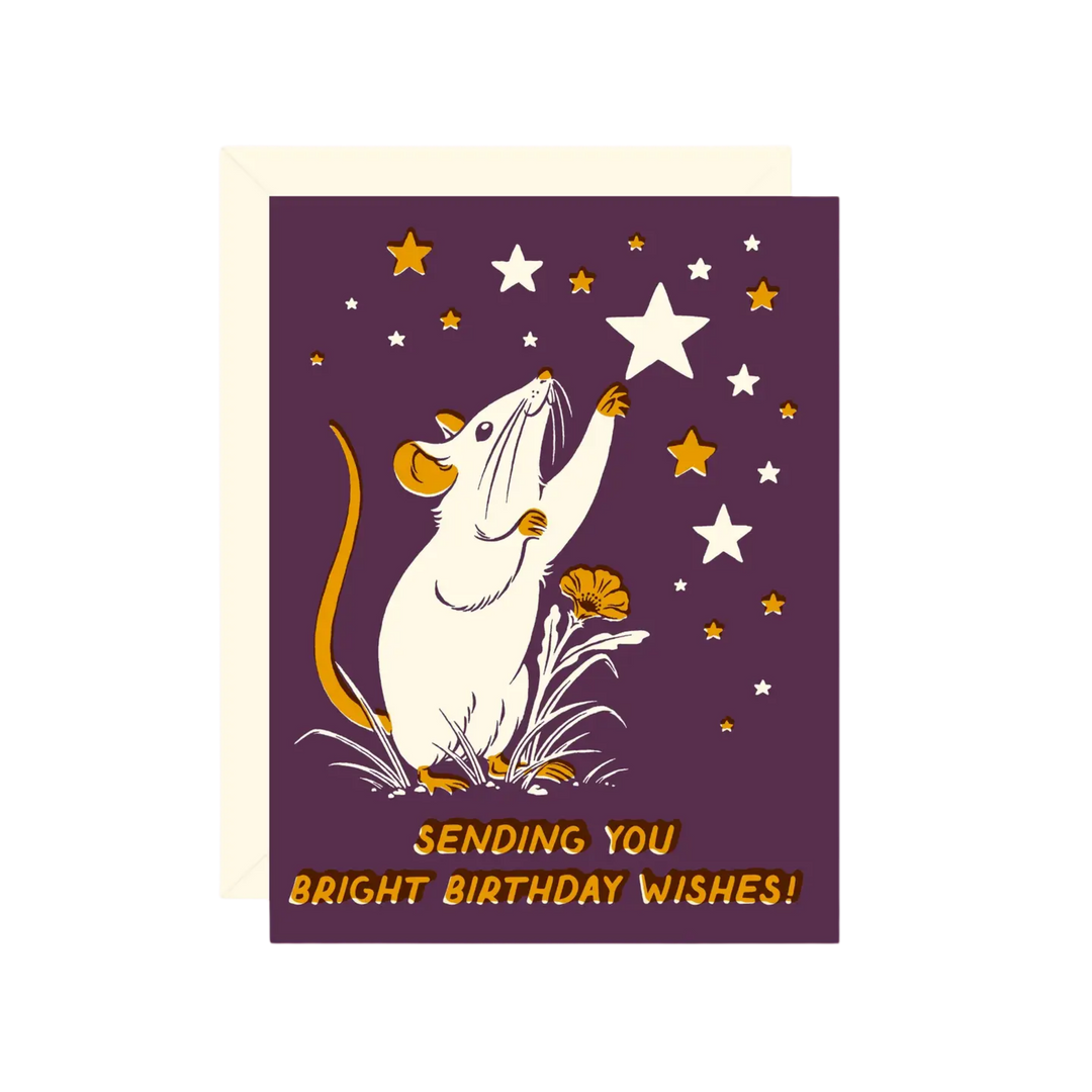 A tiny mouse with big dreams is here to send some starry birthday magic your way! Featuring sweet illustrated charm and the message “Sending you bright birthday wishes,” this card is perfect for lighting up someone’s special day.
