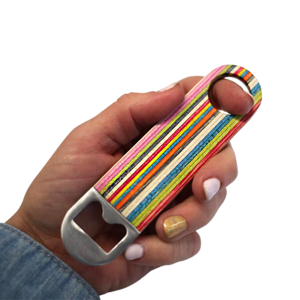 Introducing the Bottle Opener- Small, with a sleek design made from recycled skateboard and stainless steel – it's the perfect tool to tackle those tough-to-open bottles! And because of its pocket-size (4.75 x 1.25”) it's great for any occasion – from cracking open chill beers around the campfire to opening a snazzy bottle of bubbly!