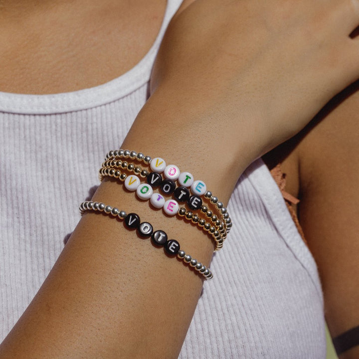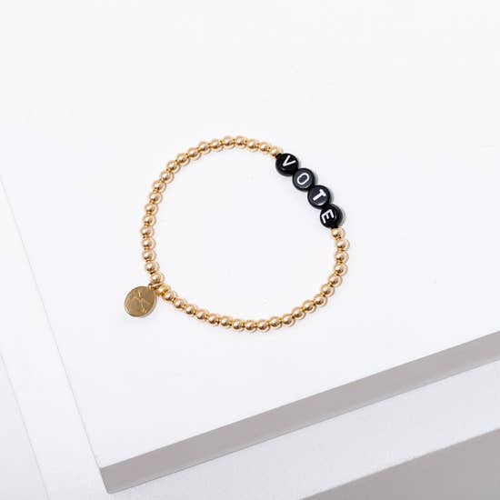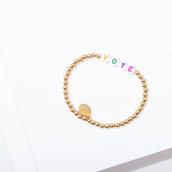 This babe features your choice of 14k gold filled or sterling silver beads - plus your choice of black or rainbow letter beads - on a stretchy band with the phrase VOTE.