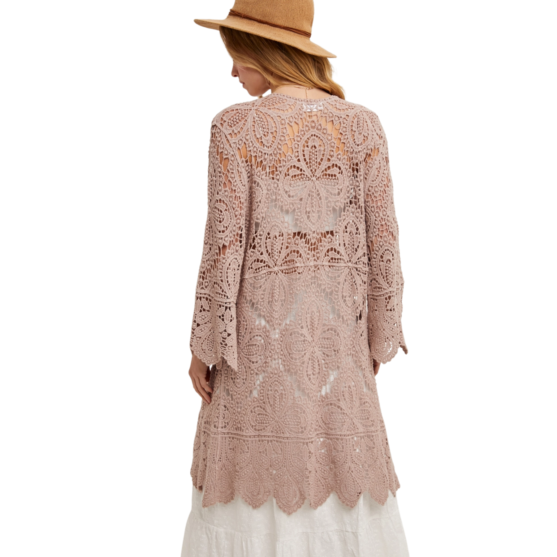 The layer you didn’t know your wardrobe needed. With intricate crochet work and dreamy bell sleeves, this knee-length cardigan brings a little drama (the good kind) to any outfit.