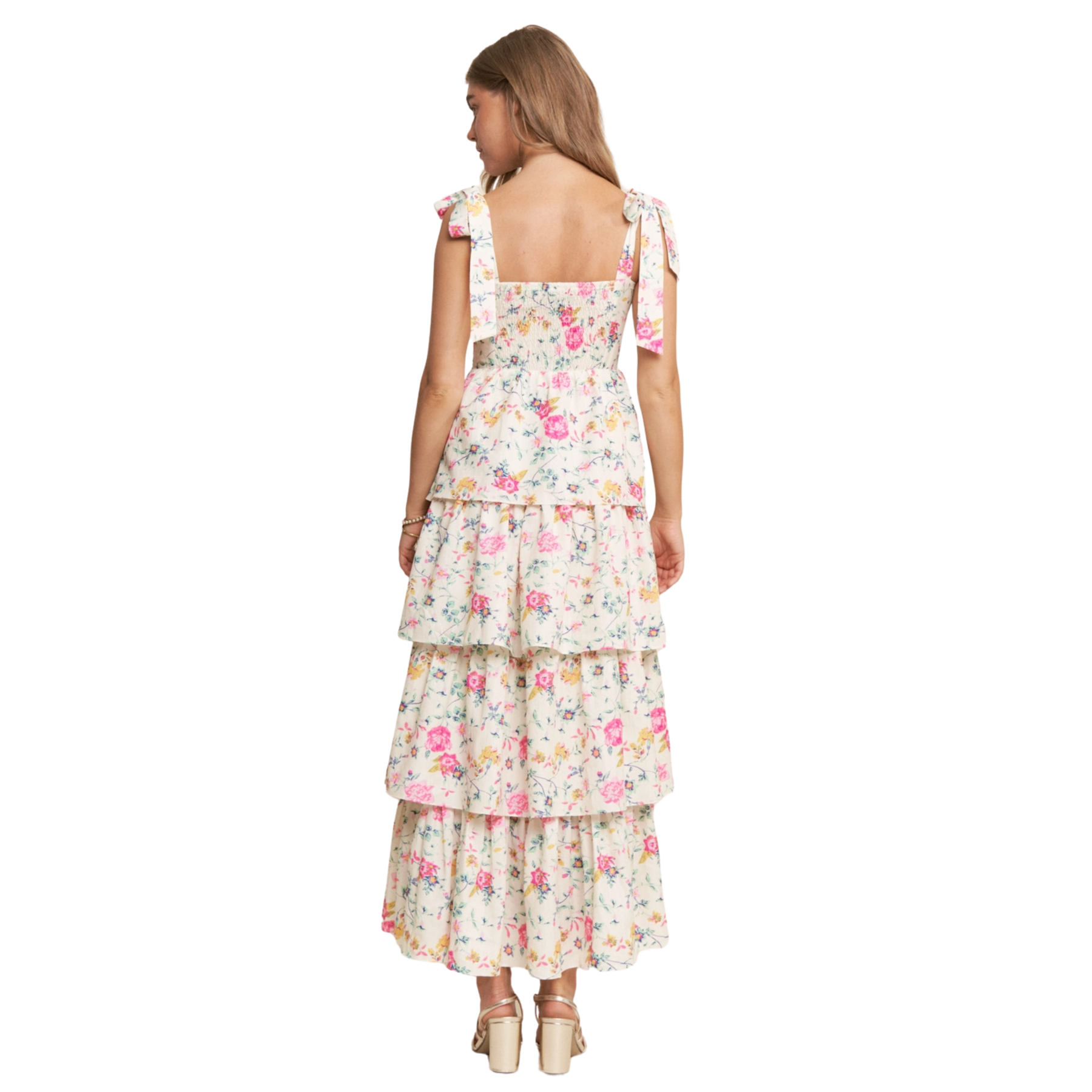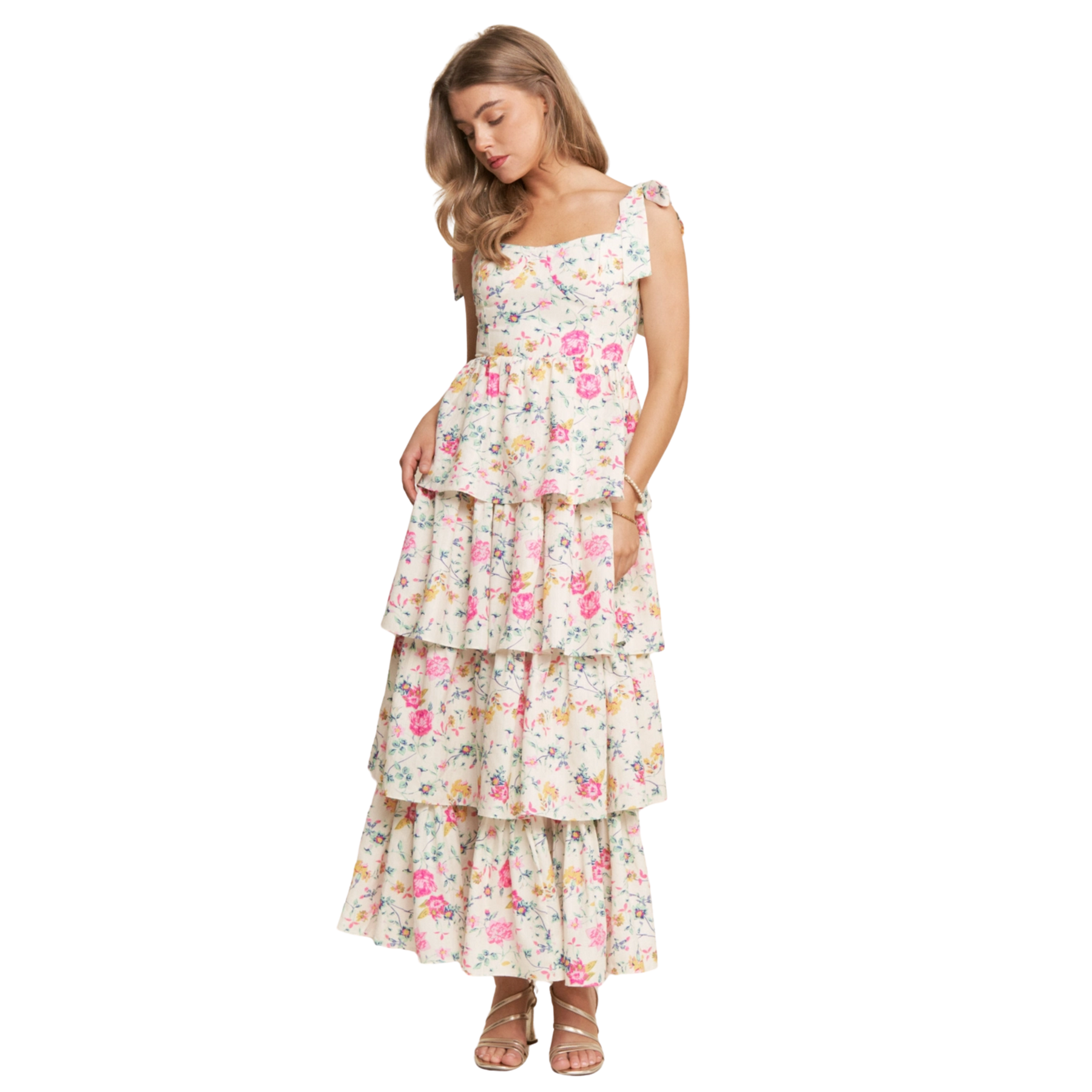Feminine and floaty, this pink peony print maxi dress brings major romantic vibes. Featuring an empire neckline and adjustable tie straps, it’s designed to flatter while keeping things light and breezy. The tiered silhouette gives it an effortless, flowy feel—perfect for sunny strolls, garden parties, or casual brunches.