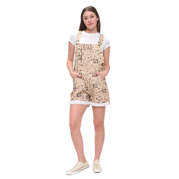 Calling all cowgirls, desert dreamers, and doodle art lovers—these shortalls are your new summer uniform. Featuring sketch-style horses, steer skulls, and cacti on a sandy beige backdrop, they're basically a Western postcard you can wear. 🌵✍️