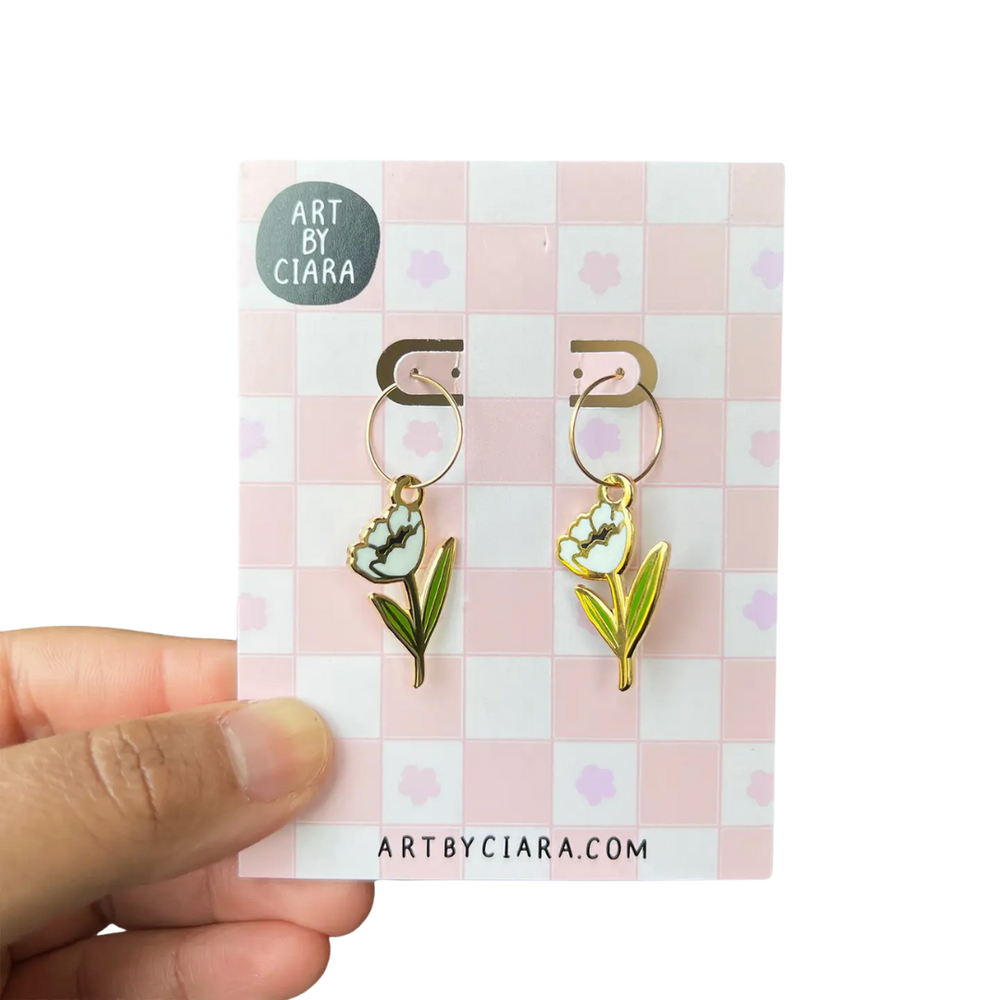 Elegant, vibrant, and full of charm—these tulip hoops are a fresh bouquet for your ears. Designed by Ciara Sana, the original artwork is brought to life with hard enamel inlay and polished 14k gold-plated brass, swinging gently from 14/20 gold-filled hoops. A perfect pick-me-up for any season. ✨🌼