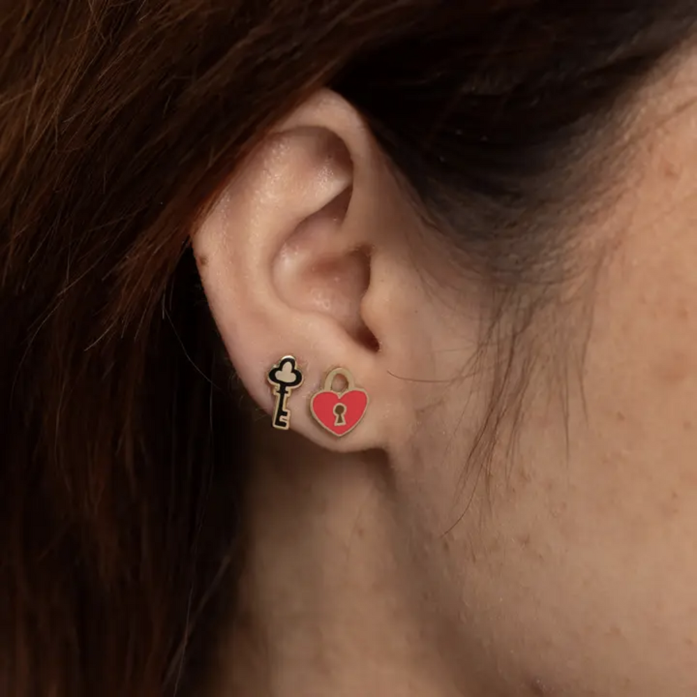 Showcase the key to your heart with these sweet and symbolic earrings! Designed as a mismatched yet perfectly paired set, this charming duo features a golden lock and delicate key, making it a perfect gift for a loved one or a self-love reminder.