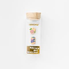 These playful mismatched earrings feature a bubbly seltzer can and a zesty grapefruit, celebrating refreshing vibes with a touch of glam!