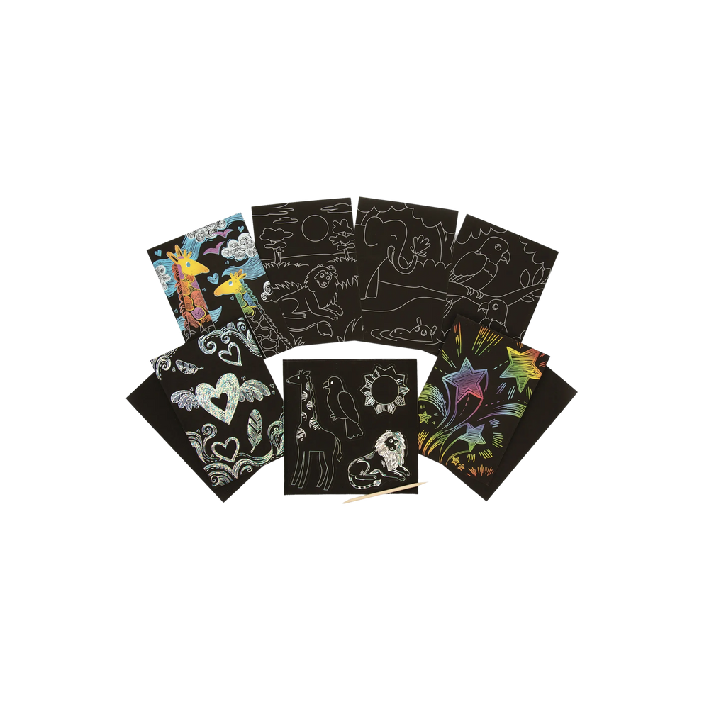 🎨 4 illustrated scratch cards (5.8” x 8.3”) for easy guided designs