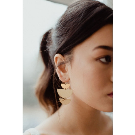 Brass Earrings No. 29 feature a stacked semi-circle design with gold-filled hooks, perfect for sensitive ears. Lightweight and eye-catching, they’re ideal for adding a statement to any outfit.