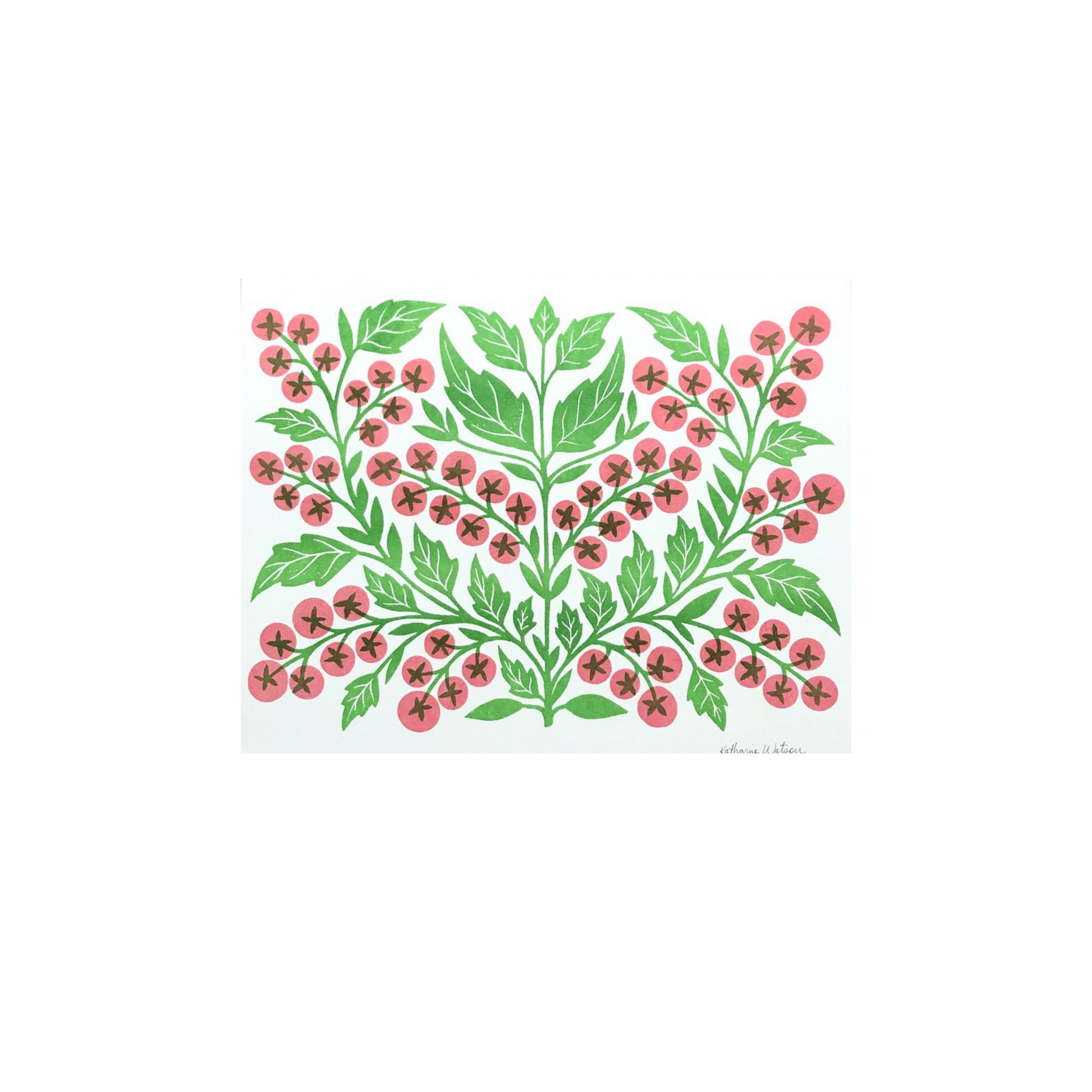 An original Katharine Watson tomato print, risograph printed in a bright color palette of green and red.