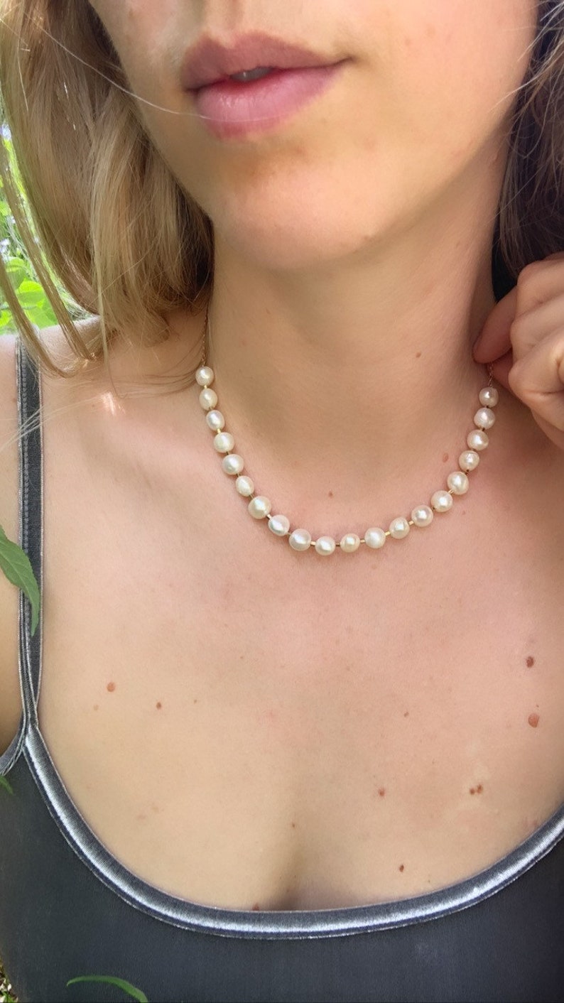 This gorgeous necklace showcases a neckline of white Freshwater Pearls on a 14K Gold-filled chain. Beaded with small gold-filled accent beads in between each pearl. This beauty lets the iridescence of pearls take charge.