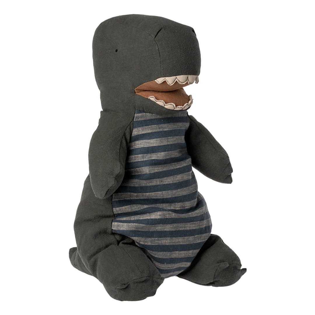 Look out… and then give this silly dino a big hug! This funny friend has arrived with a toothy grin and a whole lot of personality. Made from a soft blend of ramie and cotton, with a striped linen-cotton belly that’s perfect for pats and squeezes.