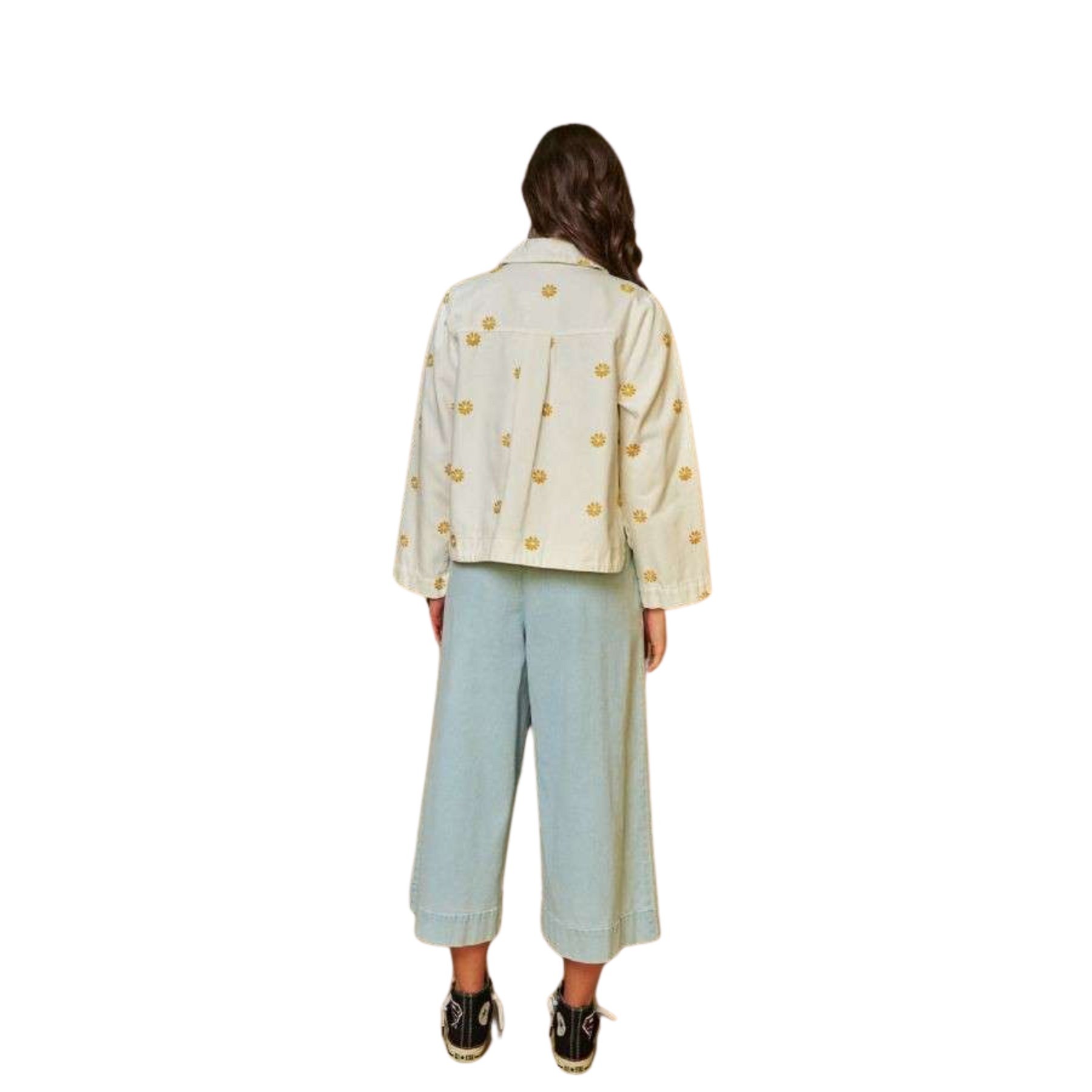 This isn’t your average denim jacket — with sweet daisy embroidery, wide sleeves, and cargo pocket details, it’s a statement layer with a soft edge. Crafted in a comfy cotton blend with just enough structure to keep it cool and casual.