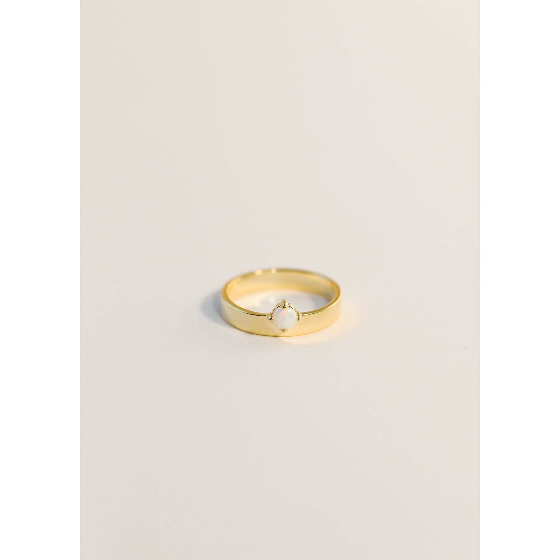 A delicate drop of bright White Opal inspires happiness and creativity, on a double width band of silky rich gold made for stacking. An offset stone is made to stack any which way you choose.