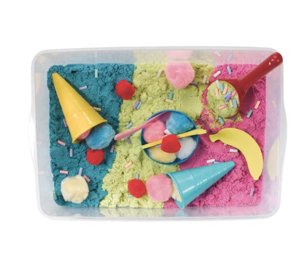 Pretend you are an ice-cream man while engaging your sense of touch with an ice-cream shop themed sensory bin! Play with sensory sand, pom poms and rainbow beads to build fine motor skills and promote sensory development.Parents and children can enjoy hours of imaginative play together! Complete cognitive tasks found in the illustrated instructions like “Name each item and color” to encourage thought, perception and knowledge in your child.