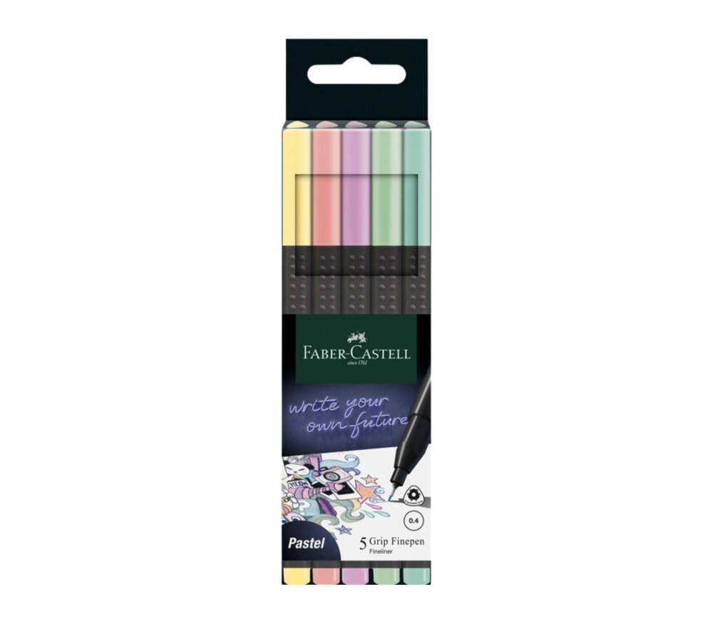 Grip Finepen, 0.4, set of 5. Ideal for thin lines and shading: the fine pen features an ergonomic triangular barrel that automatically promotes a tripod grasp and ensures optimum writing comfort.