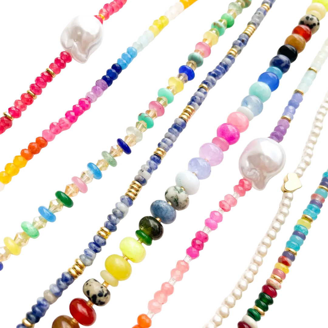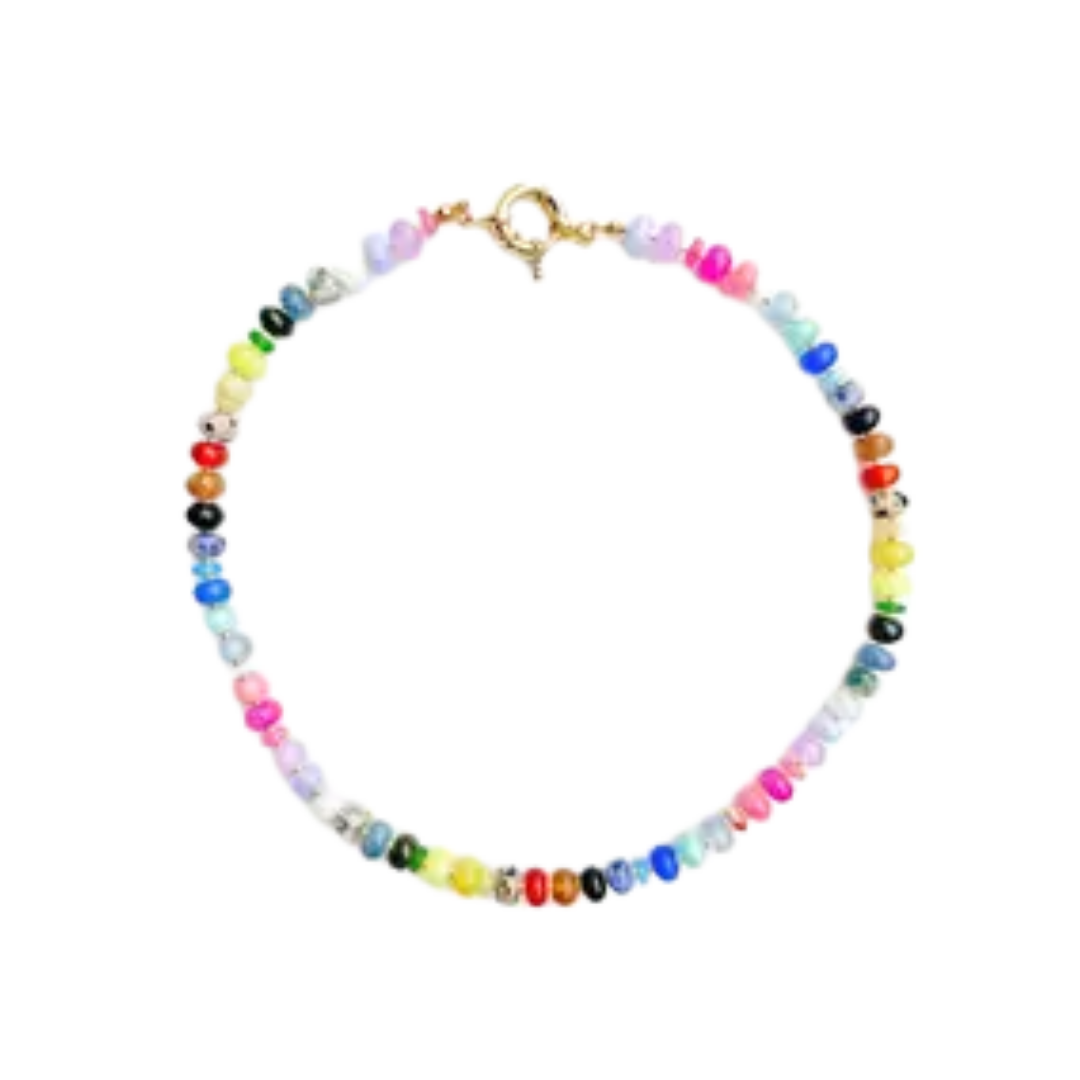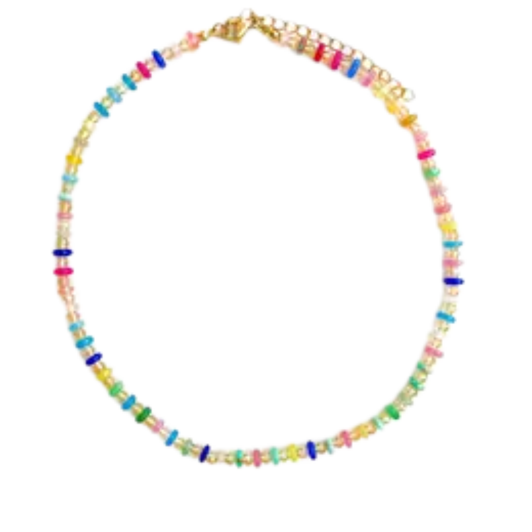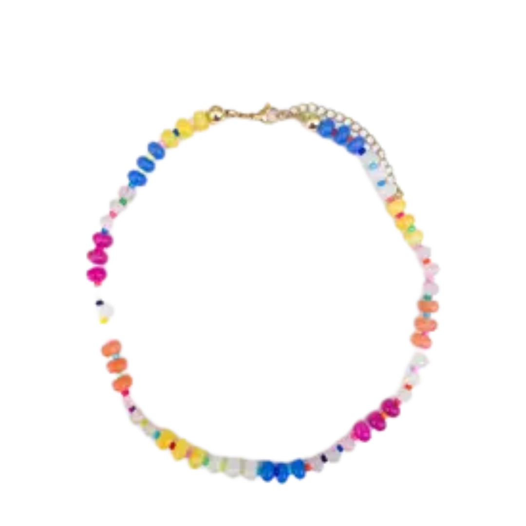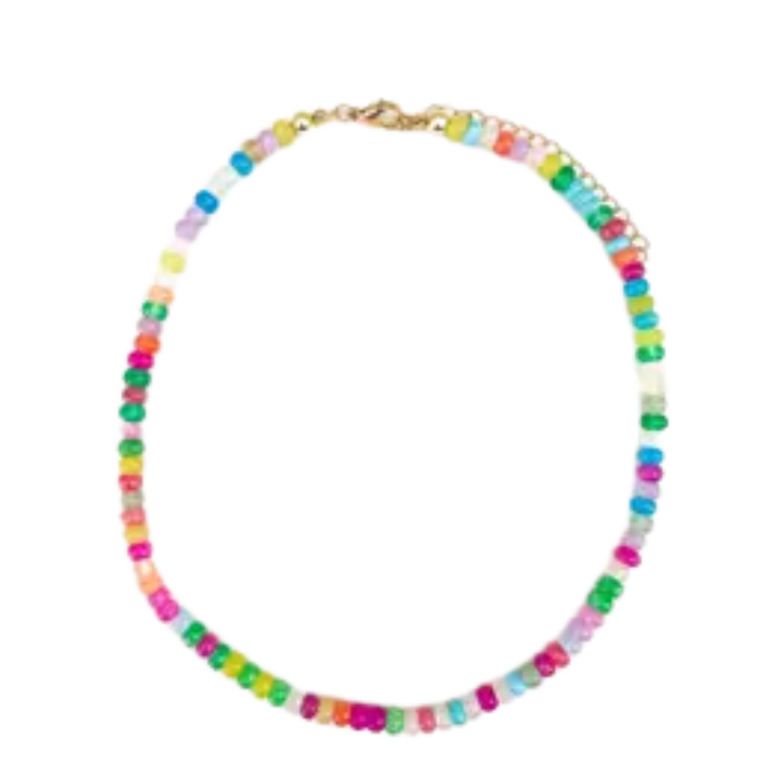 Sweet like candy and twice as cute! This vibrant beaded necklace is a rainbow dream, featuring a playful mix of gemstone beads in juicy shades of cobalt, peach, fuchsia, yellow, mint, soft pink, and more. From translucent to opaque, every bead brings its own charm—perfect for adding a pop of color to any outfit!
