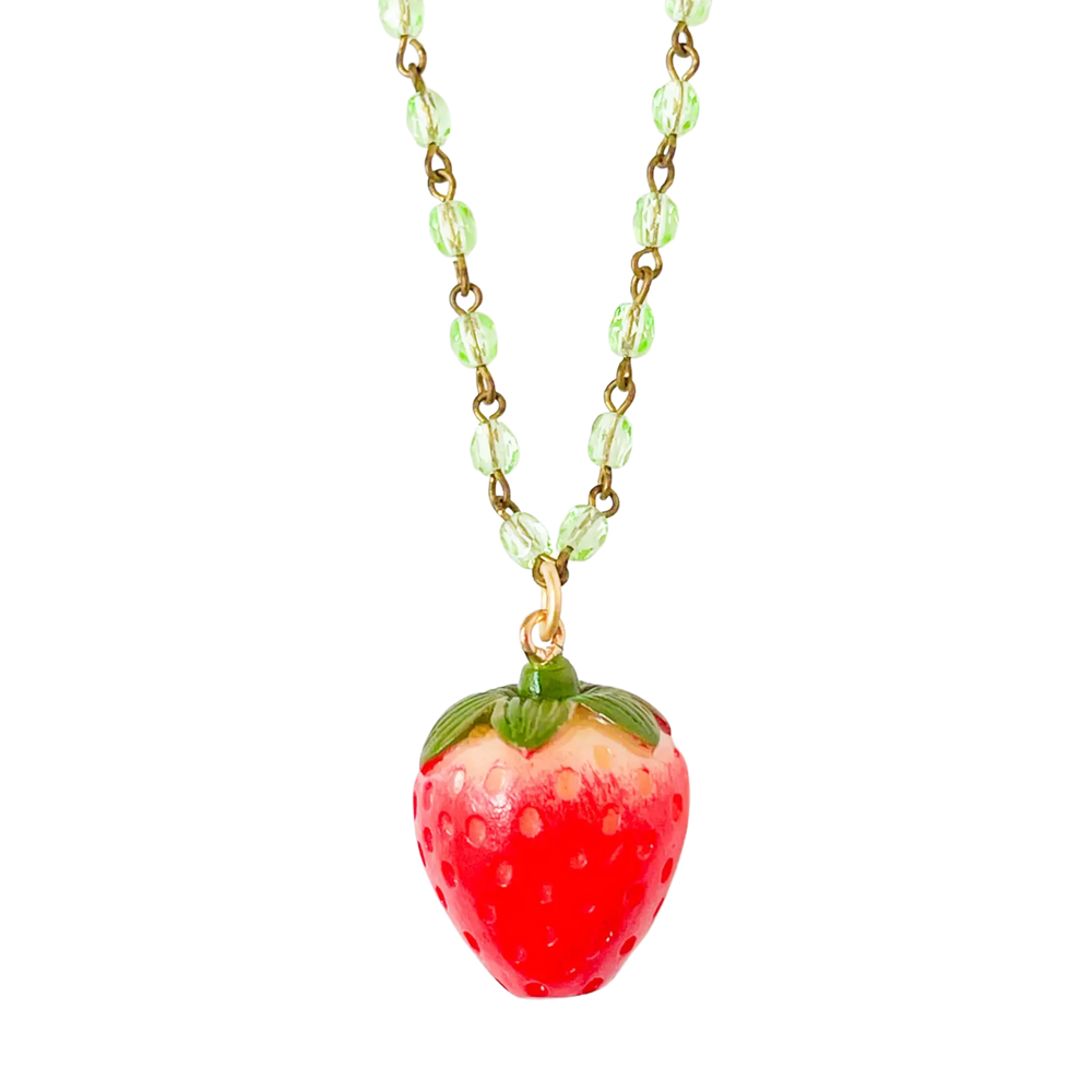 Strawberry Charm Necklace with Green Beads