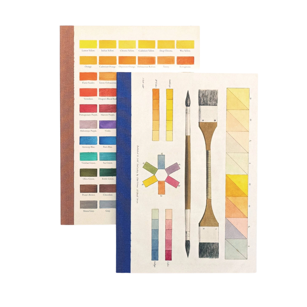 Note, sketch, or jot down your brightest ideas with this charming set of two A5 lined notebooks. Each matte-finish cover features a carefully restored vintage color theory illustration—one from an 1805 watercolor landscape book, the other adapted from Robert Ridgway’s 1886 Nomenclature of Colours, created to standardize bird color descriptions. With premium fabric spines and 50 lined sheets each, these notebooks are equal parts practical and inspiring.