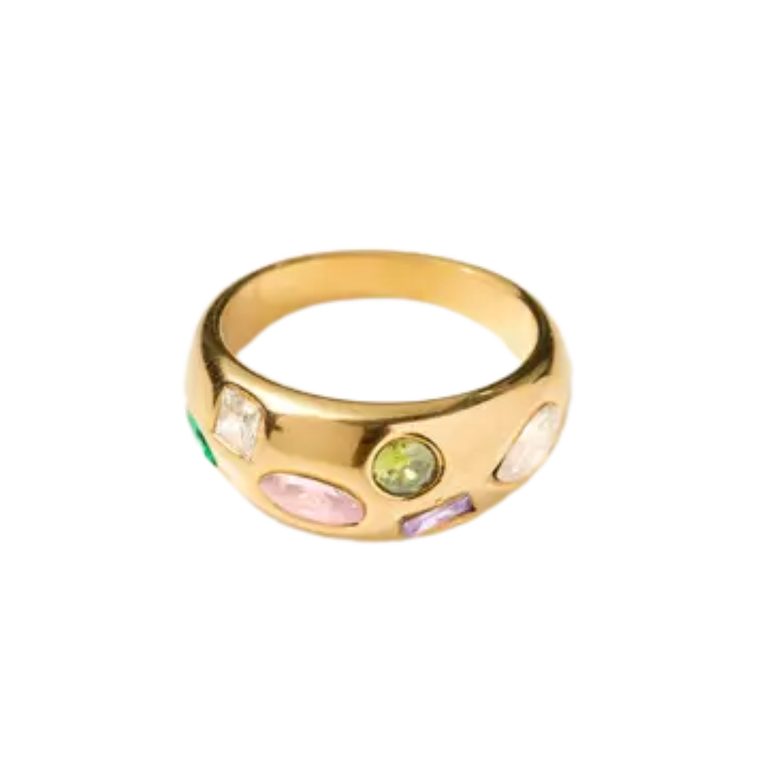 Stand out from the crowd with this bold and beautiful statement ring. Featuring a stunning mix of multicolor cubic zirconia gemstones set in luxurious waterproof 14k gold-plated stainless steel, this chunky design delivers maximum sparkle and personality. Perfect for adding a pop of color to your everyday look or making a statement for a special occasion.