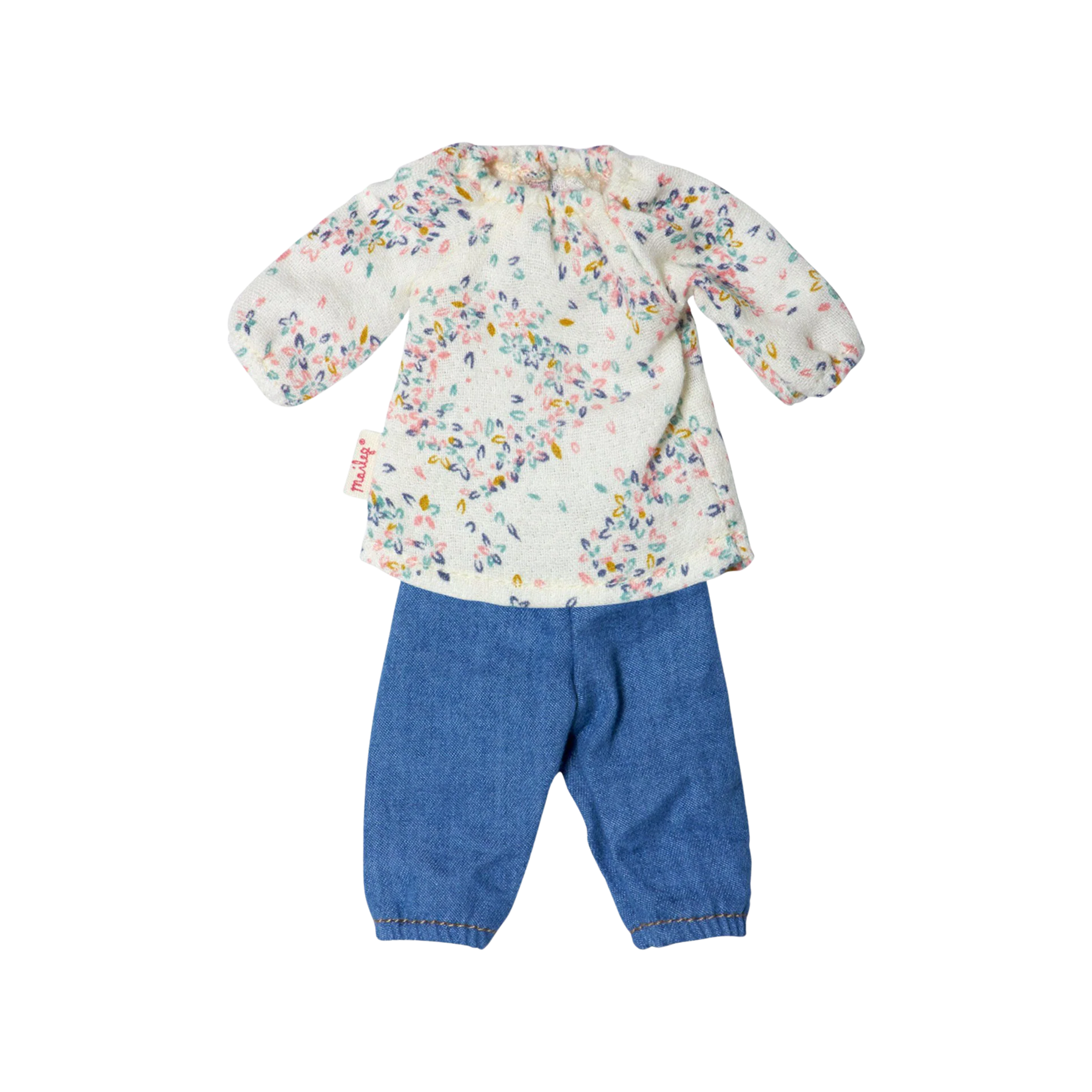 Outfit ready for a day of play! This charming two-piece outfit includes classic blue jeans and a soft cotton tunic—perfect for dressing up your Maileg sister for adventures, tea parties, or strolls around the dollhouse.