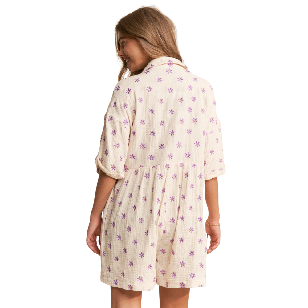 Say hello to your new go-to outfit for sunny days and easy vibes! This women’s romper features a relaxed half-sleeve silhouette, a flattering button-up V-neckline, and delicate daisy floral embroidery for just the right touch of charm. Whether you're brunching, strolling, or lounging, this romper keeps it cute and comfy.