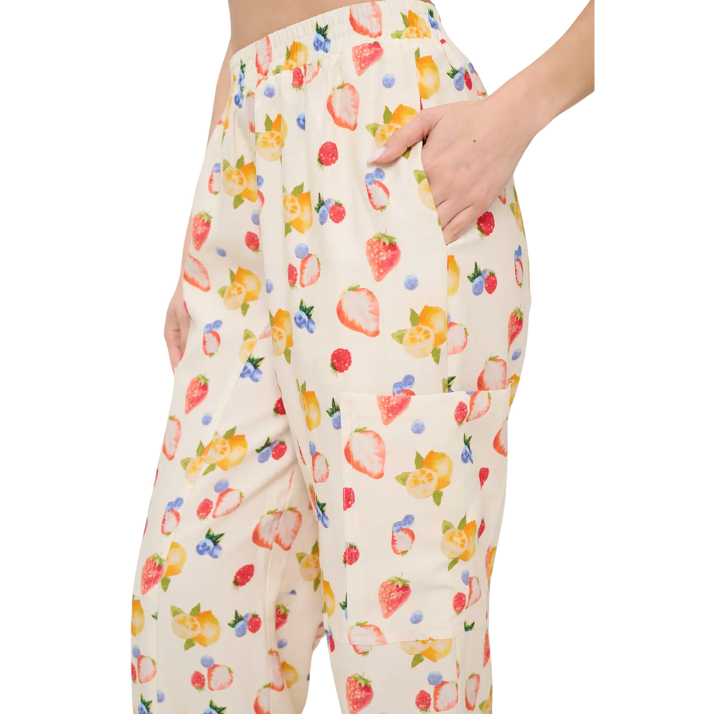 These colorful cargo pants are bursting with berry sweet charm—featuring strawberries, blueberries, and lemons in a playful all-over print. With a relaxed fit and plenty of pocket space, they're ready for picnics, park strolls, or whatever sunny plans you’ve got cookin’.