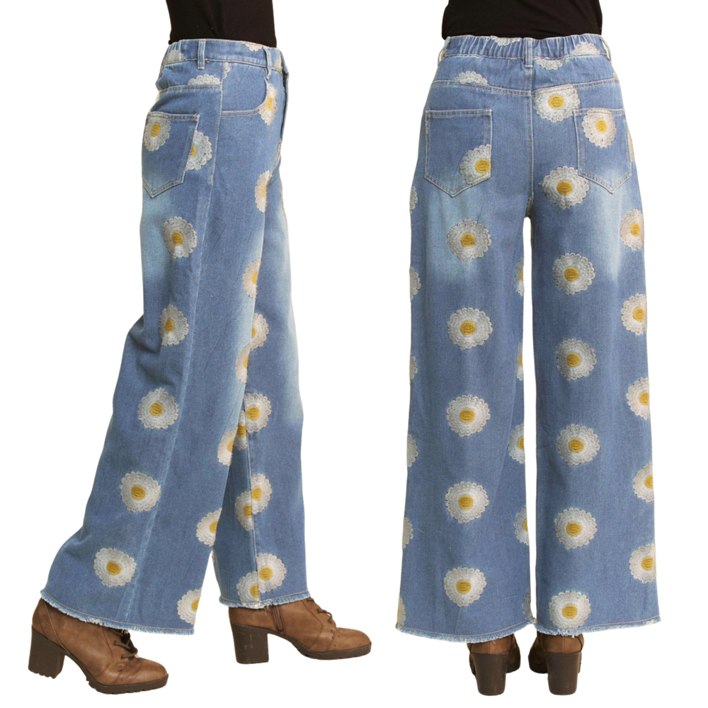 Say hello to your new go-to jeans with a playful twist! These wide-opening denim pants feature a sweet daisy print and roomy side pockets, blending everyday comfort with feel-good style.
