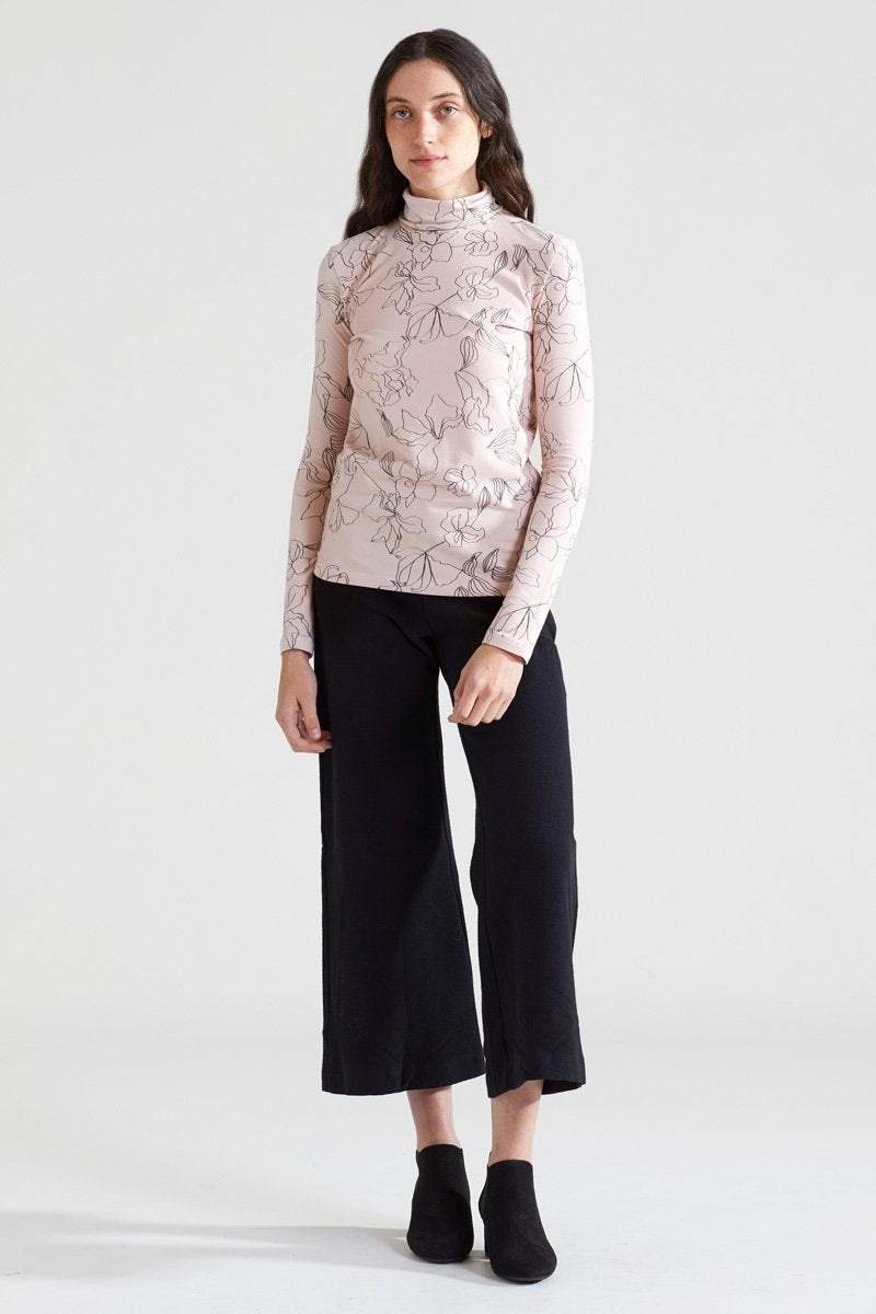 This organic cotton turtle neck has full length sleeves and a long body for a perfect fall / winter layer. The fabric is super soft and stretchy with excellent recovery. Cute tucked in or worn over pants. Handprinted with our flowers print in black.