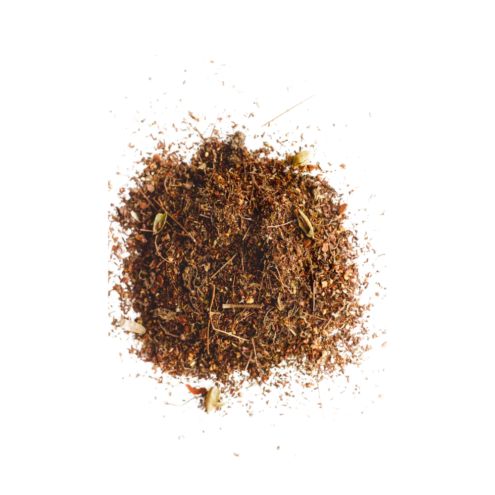 Tulsi and red rooibos are blended with freshly ground cardamom, cinnamon, allspice, star anise, ginger and peppercorn. It's a peppery tea that will make you blush it’s so good.