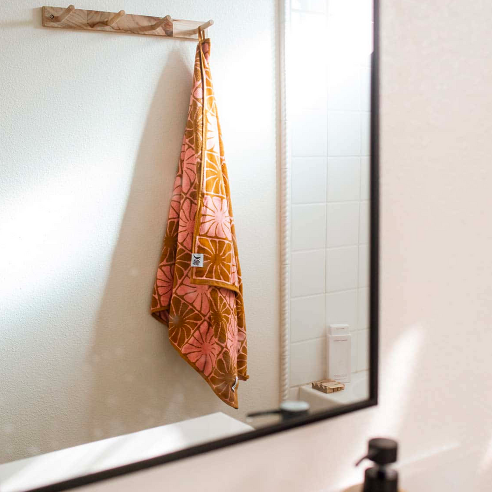 Made from 550 gsm cotton. What does that mean? It means it's likely the softest & coziest towel you've experienced - without needing to be bulky and heavy. Or in other words- it's your new favorite bath towel. Highly absorbent, what good is a towel that doesn't dry you off? The looped terry design (on both sides) always picks up what you're putting down. ("looped terry" is also a great unused band name, btw) Smart hanging loop Hangs easily to dry or store - no more unexpected floor towels! Beautiful (like you) Your towel style matters.