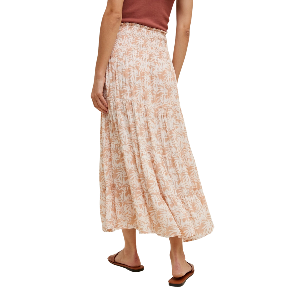 Introducing the Tropical Tiered Midi Skirt with Slit. This elegant piece features a smocked waist and is fully lined for extra comfort and support.