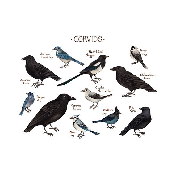 This watercolor painting features the common Corvids of North America as a field guide classification chart. Corvids are of the bird family corvidae, and are super smart birds like crows and jays.