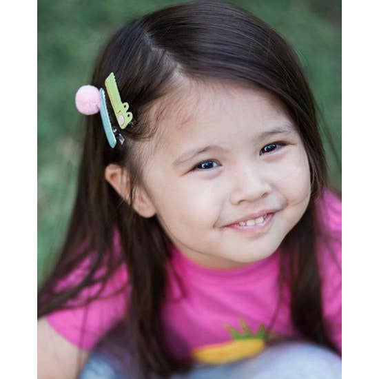 Animals and pom poms are a combo that just can't miss! One cute green alligator clip match with an aqua clip with pink pompom to make a colorful combination that your favorite kiddo will love every day.
