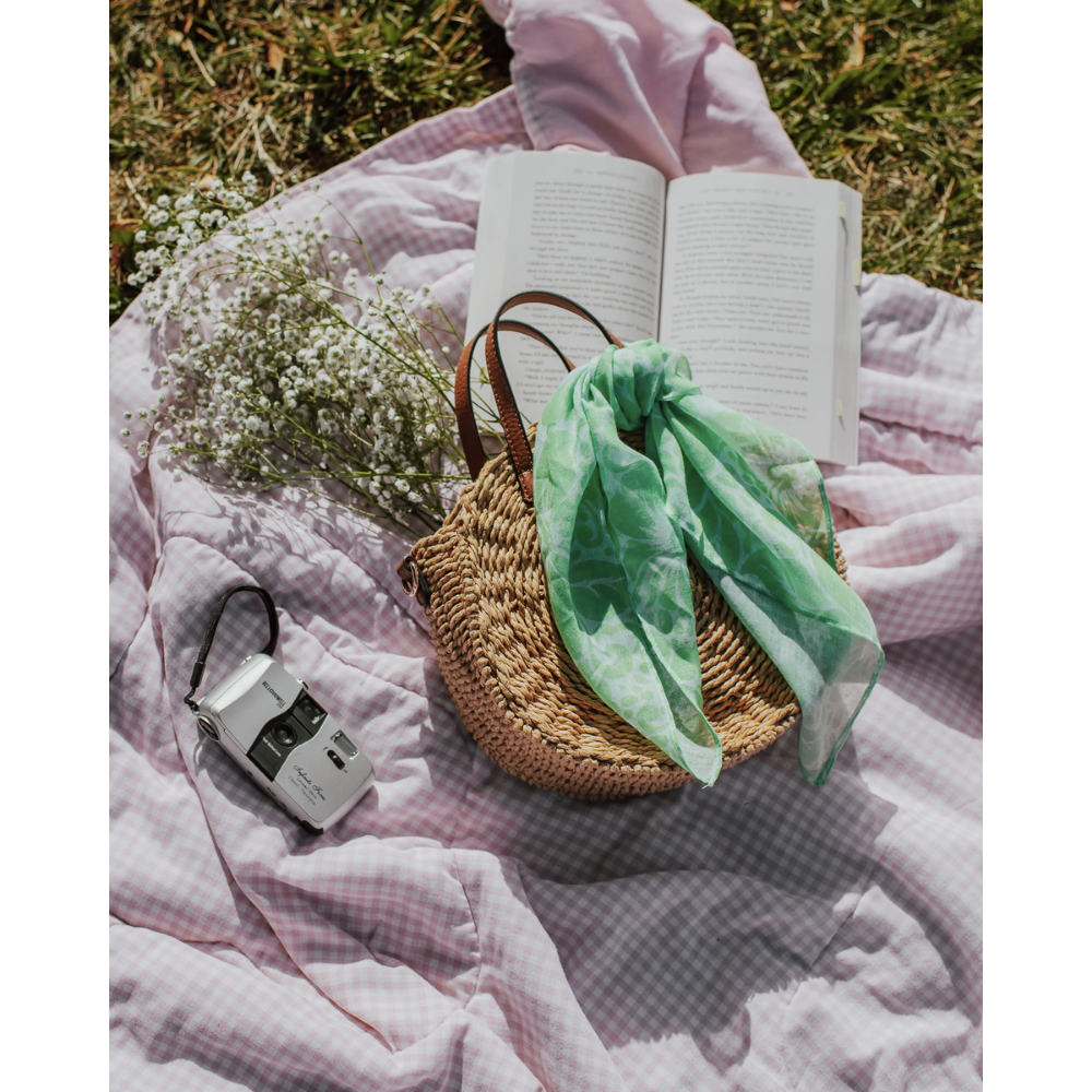 Green Tropical flowers are imprinted on this special bandana textile. This bandana will be here for all of your island lover dreams. Don't let this one drift away, it's a must-have!