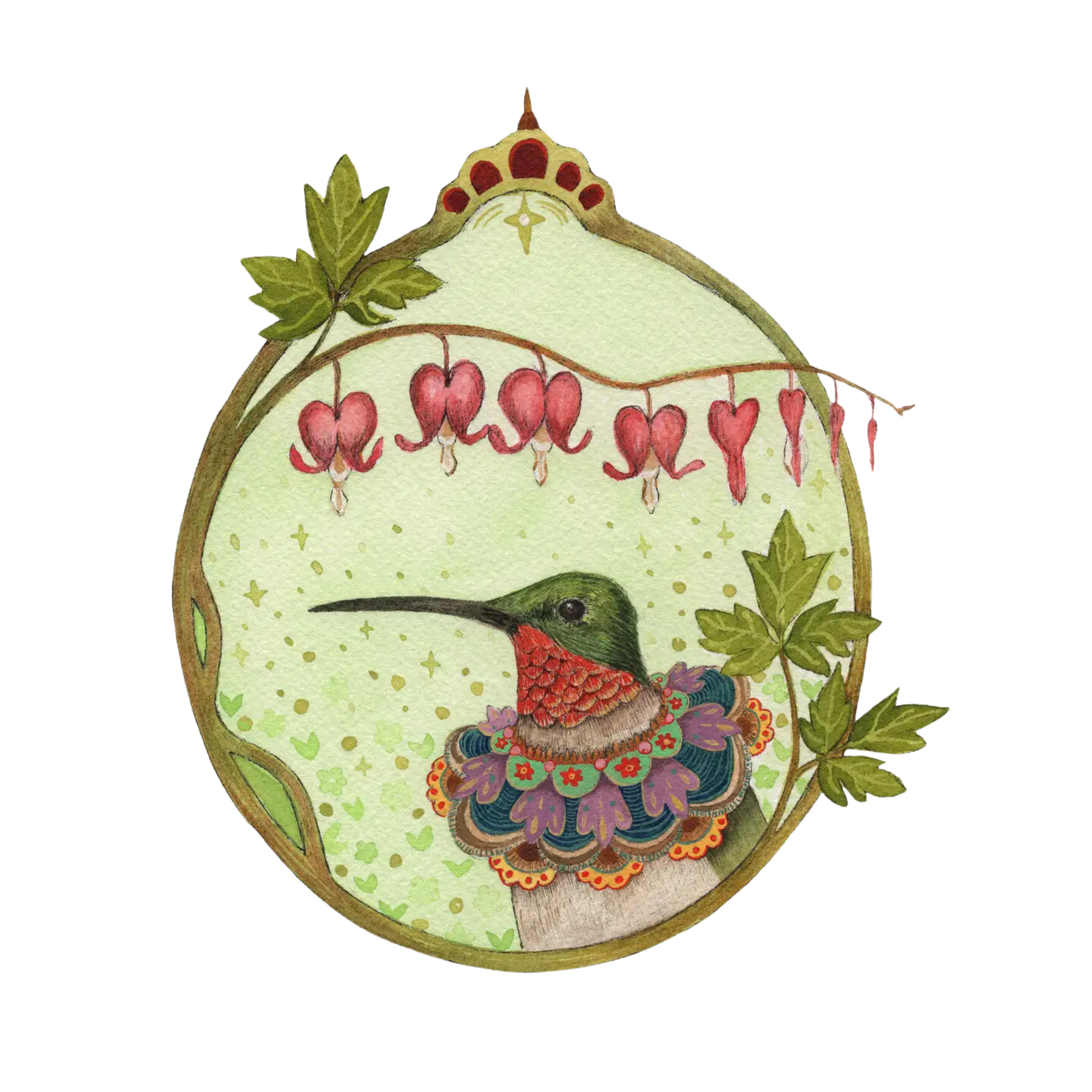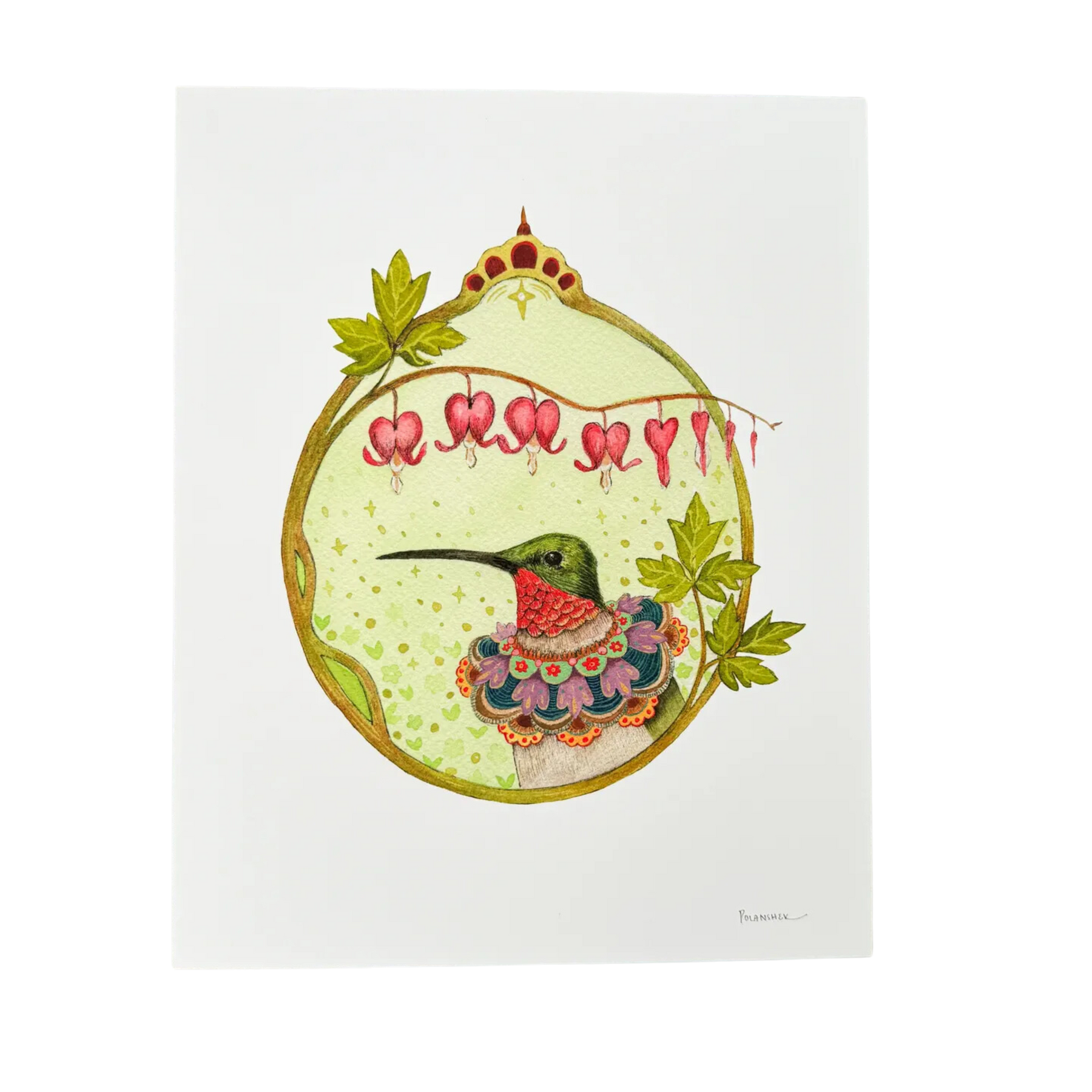 Floral Flight Crew: Hummingbird of Bleeding Hearts This is a quality reproduction of an original illustration. The original was drawn in pen and then painted with watercolor on paper. The Epson paper this is printed on has a smooth, matte finish that gives the long-lasting and lightfast inks excellent clarity.
