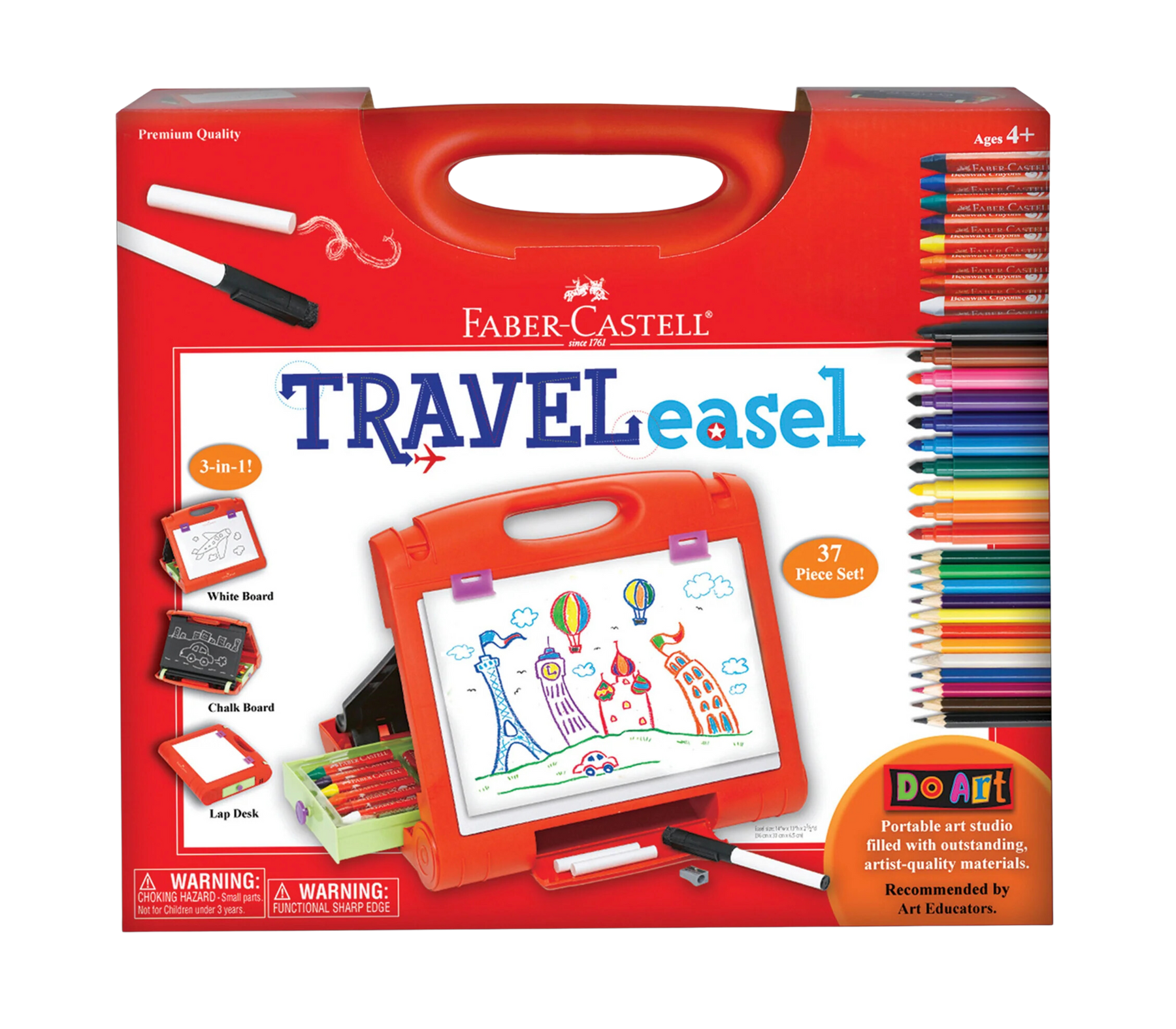 The 37-piece art set for kids comes with everything you need to color, draw, and explore on the go! Includes jumbo beeswax crayons, mini colored ecopencils, markers, chalk, dry erase marker with incorporated eraser, sharpener, sponge and sketch pad designed for on-the-go art the do art travel easel is completely portable! All your supplies fit neatly inside when not in use.