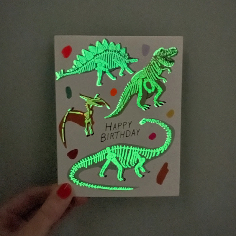Make their birthday roar with the Happy Birthday Glow-in-the-Dark Dinosaurs Card, featuring playful dinos with glow-in-the-dark "bones" for an extra surprise after dark!
