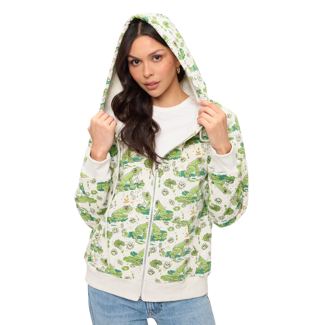Lily Pads and Frogs Print Zip Up Hoodie