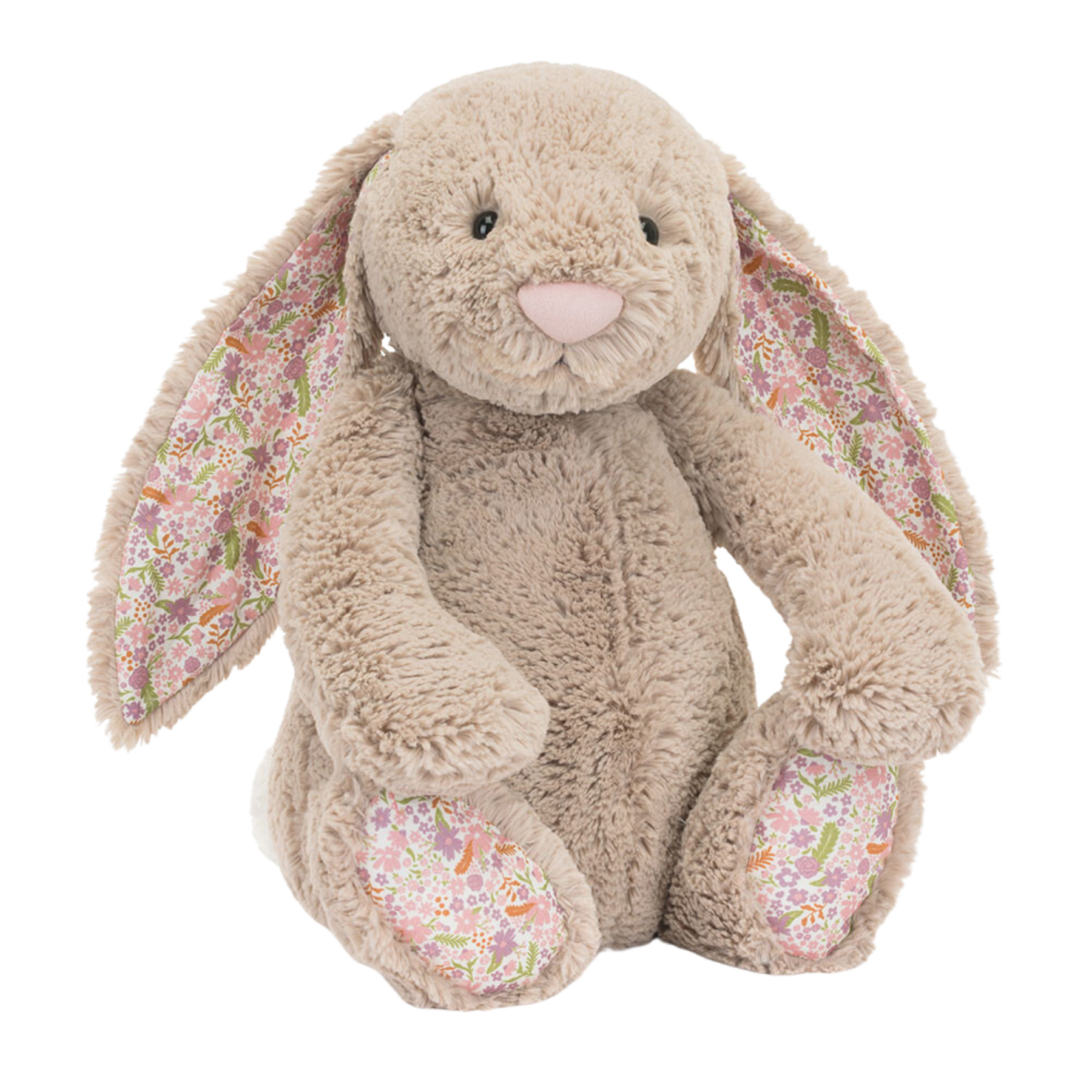 Blossom Beige Bunny has been frolicking in the meadows, and has found some special flowers. In iconic Bashful beige fur with a cream bobtail, Blossom Beige Bunny has soft cotton floral ears and feet, printed with an original Jellycat design of pink and purple flowers. Bringing floral patterned joy to all ages!