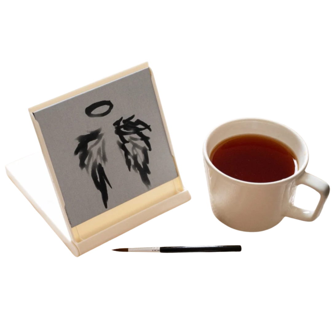 The Mini Buddha Board is the mini version, 5-inch square portable, designed for mindfulness on the move. It includes a small paint brush, a little trough for water if desired, and a stand, so you can create anywhere.