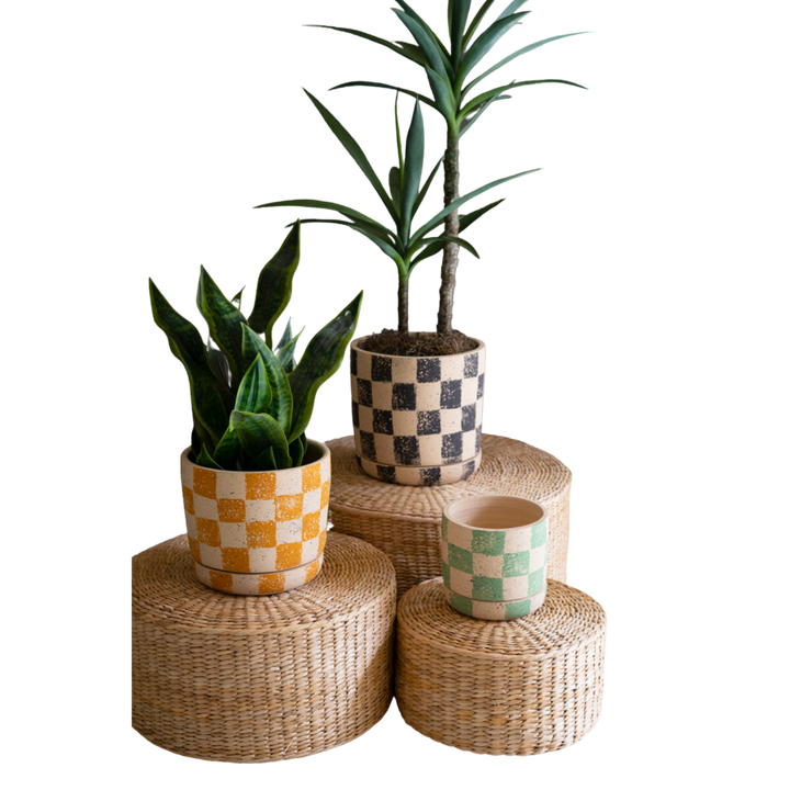 Small, medium, and large sizes of checkered clay pots with drainage tray.