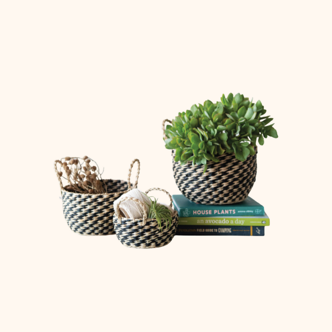 Black & Beige Hand-Woven Seagrass Baskets with Handles