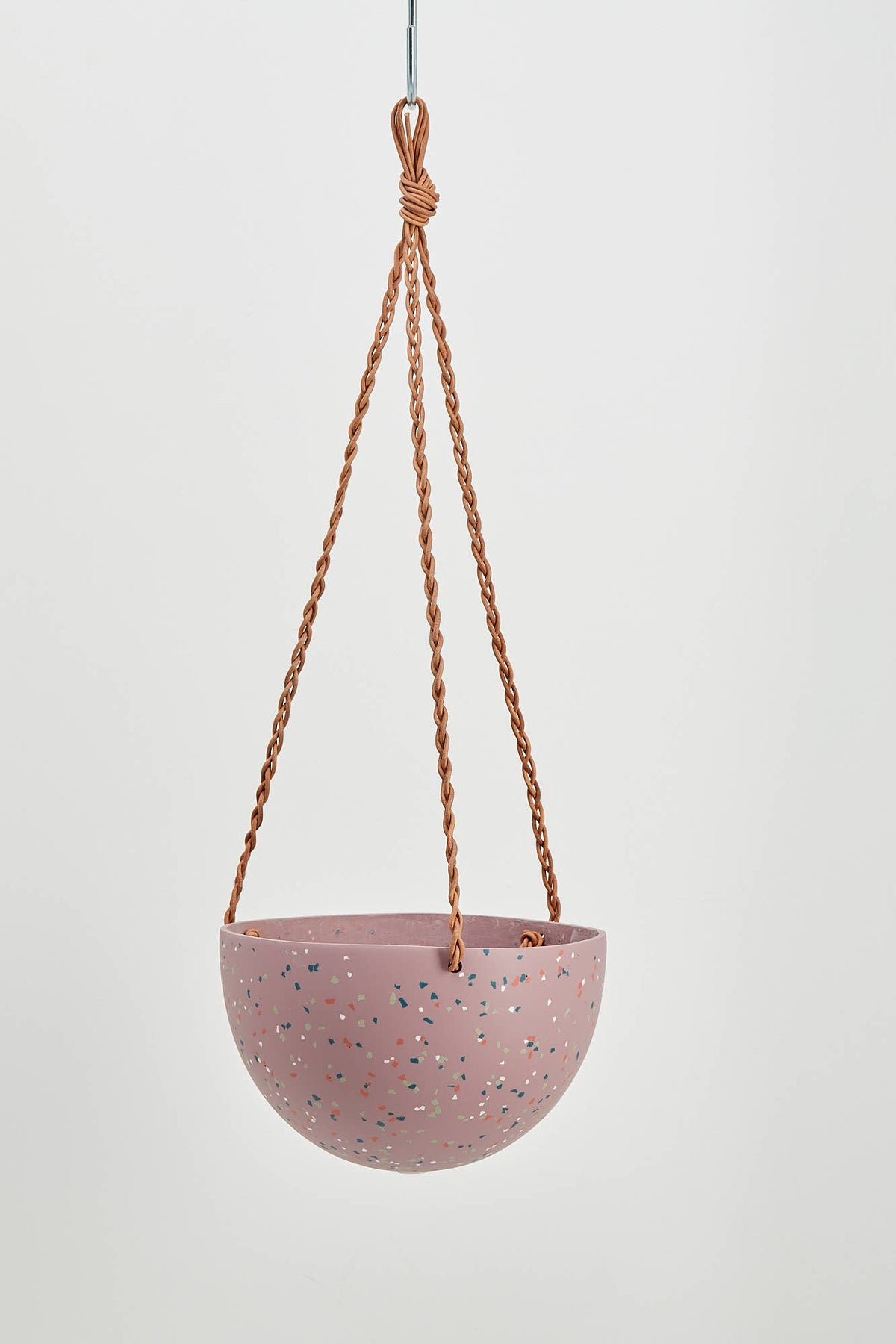 These hanging planters are skillfully hand made from a resin and finished with tan leather. Each planter has a hole in the bottom for drainage and a plug for convenience. Irregularities in colour and pattern of each finished product are evidence of the hand-made process.