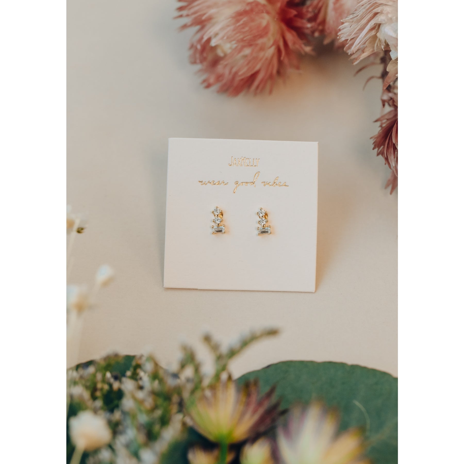 A singular soft white baguette slopes delicately down from a dainty duo of circular set CZs. Show this pair off with your sleek chignon, or in your post-workout bun.