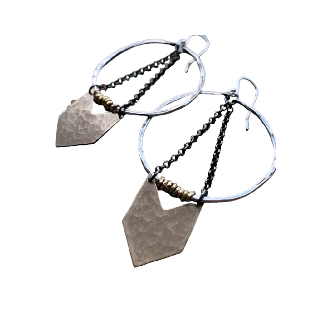Medium Warrior Earrings- Silver Hoops, Brass Chevron