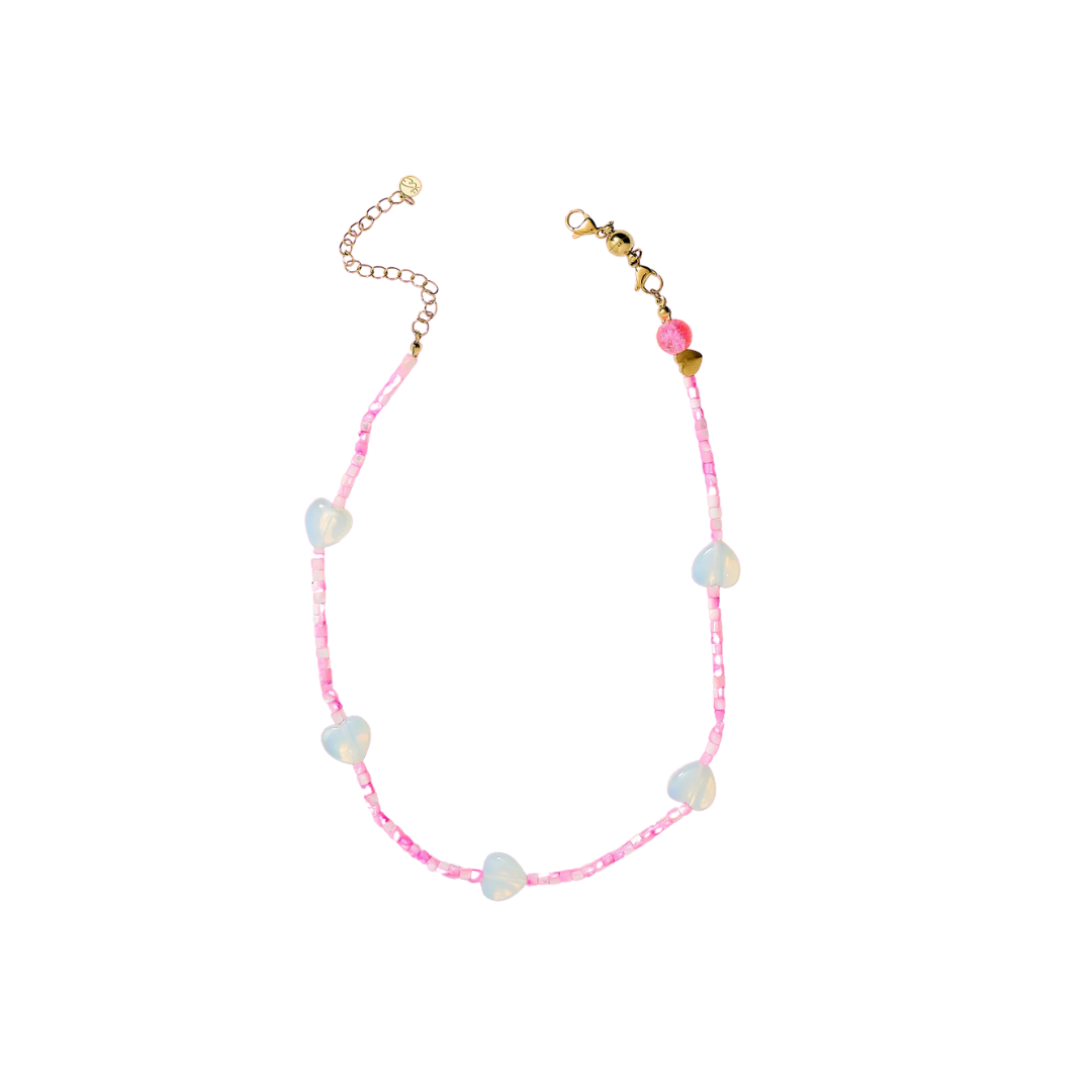 Beaded Necklace – Pink with Opalite Hearts - Amore