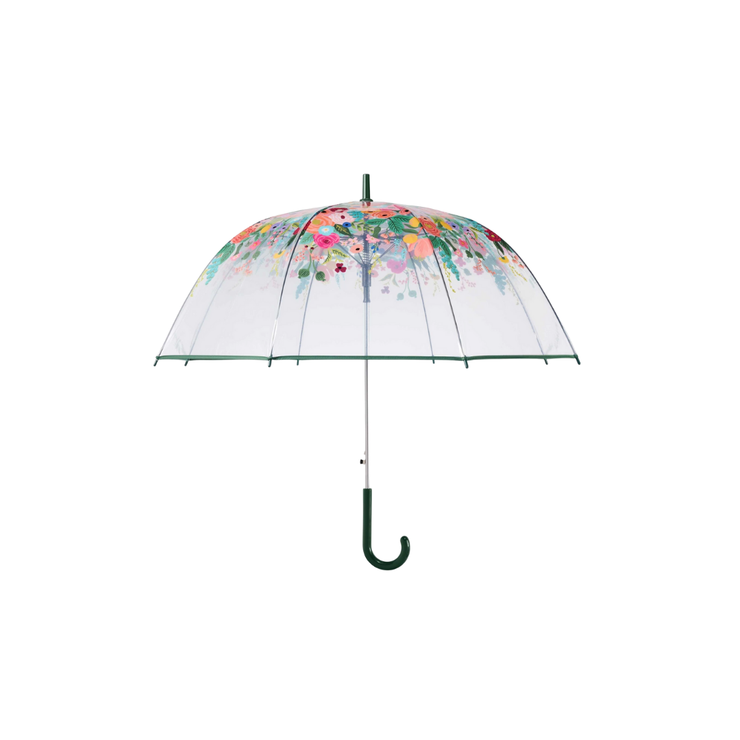 A little sunshine for rainy days. This clear Garden Party umbrella features a transparent canopy printed with cheerful florals, a green hooked handle, and an easy auto open function—perfect for staying dry while still showing off your outfit.